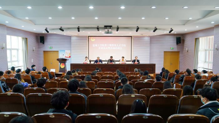 邢晓平宣读了《关于成立盐城工学院菁英人才学校第十期培训班专家导师库的通知》。奚新国宣读《盐城工学院菁英人才学校学员与导师联系的规定》。校党委学工部、学生处、招生与就业创业指导处处长徐新华宣读《关于举办盐城工学院2022年青年马克思主义者培养工程学习班的通知》等文件。新学员代表校团委学生兼职副书记、信息工程学院B网络202班倪悠洋,人文学院团委学生兼职副书记B中文202班黄蔚娴同学分别作表态发言。