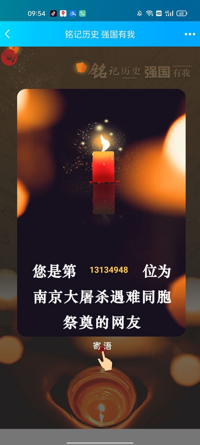 与此同时,校团属六大学生组织同学自觉参加“铭记历史 强国有我”国家公祭日全省大学生“网上答题烛光祭”活动,通过“答题”“点烛”“寄语”三个环节点亮烛光,缅怀死难者,遥寄哀思,铭记历史,祈愿和平。