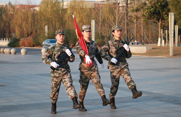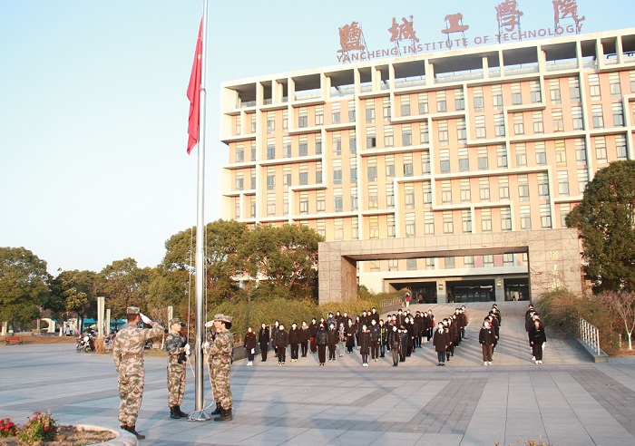 空气中弥漫着严肃的气息,微风中透出丝丝凉意。盐城工学院国旗护卫队成员迎着朝阳,护送着国旗从图书馆侧面正步走向国旗台。现场师生肃立,行注目礼并奏唱国歌。