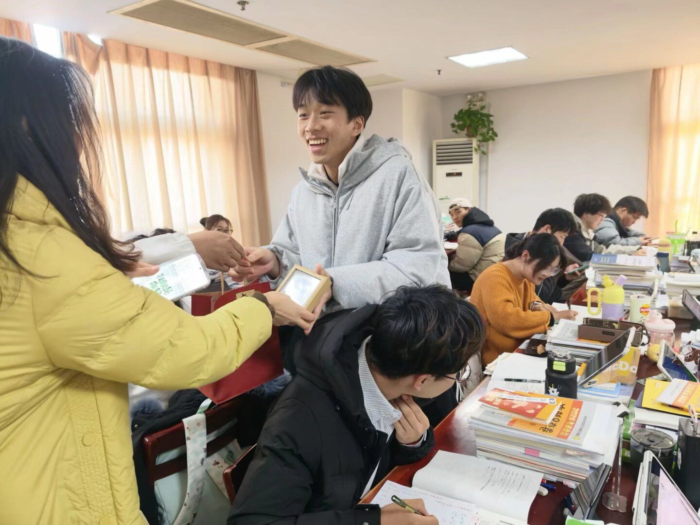 “学长/学姐,考研加油!”温暖的问候驱散了冬日的寒意。收到惊喜的学子们纷纷暂停复习,展露笑颜,眼中满是感动。一位正在背诵专业课的同学表示:“冲刺阶段压力大,这份特别的关怀很暖心,感觉不是一个人在战斗,复习也更有动力了。”活动现场虽无喧哗,但鼓励的眼神、温暖的笑容和紧握的礼物,构成了冬日校园里一幅安静而动人的画面。