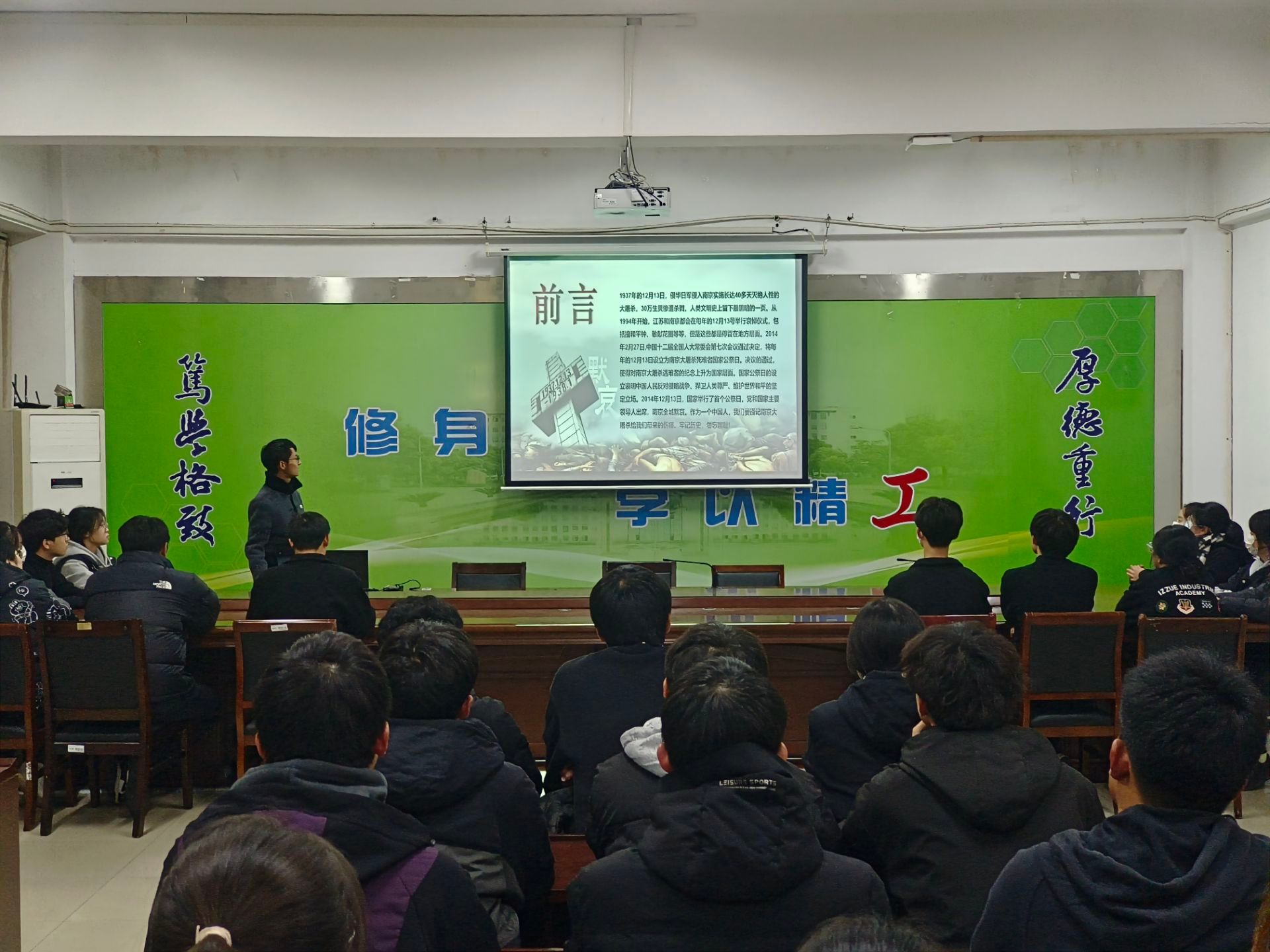 B能化232赵文翔同学说:“历史不会因为时代变迁而改变,事实不会因为巧舌抵赖而消失。我们不会忘!我们不能忘!要时刻牢记我们民族曾经所遭受的苦难,勿忘国耻,振兴中华!”