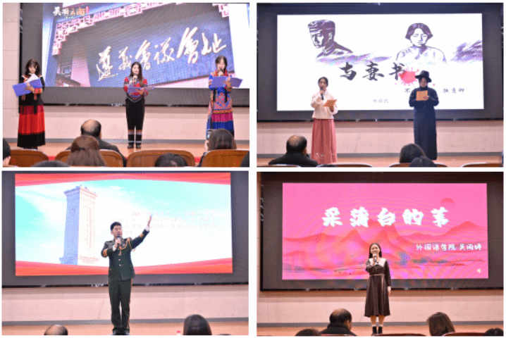 本次比赛共有来自全校各二级学院58支队伍142名选手报名,历经初赛、复赛的激烈角逐,最终15支队伍脱颖而出进入决赛。决赛现场,选手们表现精彩纷呈,各具特色,用充沛饱满的情感、富有韵律的语言层次和丰富的表演形式展现了中华经典诗文的魅力,彰显出我校青年大学生的文化底蕴和文化自信。“月光下的中国,大河奔流;月光下的中国,长城巍峨!”设计艺术学院孙浩玥同学娓娓道来,让我们看到了一个青绿流动、山河壮阔的盛世中华。外国语学院吴雨婷同学在《采蒲台的苇》结尾处毫不迟疑的呐喊,简短有力,震撼人心,将现场观众带入抗战时期人民群众面对敌人坚毅勇敢、视死如归的历史岁月。“今日我站在这里,着我彝族盛装,高唱你的赞歌,追寻红色的记忆。”人文学院惹只么鲁作等同学身着彝族服装述说着少数民族学子真挚而炽热的爱国之心。“少年强则国强!”化学化工学院唐杰鹏、王秋琳等同学的《少年中国说》抒发出当代青年学子勇于担当的时代最强音。