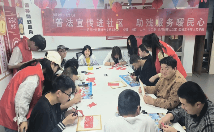 活动中,志愿者们向社区残疾人朋友们发放普法宣传单,并结合现实案例向他们解读了《中华人民共和国民法典》《中华人民共和国残疾人保障法》等法律中涉及残疾人群体在就业、创业、社会保障等方面的法律知识。志愿者们与残疾人朋友围坐一堂,共同投入到剪纸艺术创作和电子元件的手工制作中,耐心倾听他们的生活经历,共同分享人生的点滴欢乐,志愿者们用真挚的关怀和温暖的话语让残疾人朋友感受到社会的关怀与支持。最后,志愿者们向残疾人朋友赠送精心准备的小礼品,主动帮助中心完成扫地、拖地、整理桌面等清洁工作。