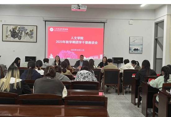 为进一步明确团学干部工作职责,促进学院团学工作高质量开展,10月11日下午,人文学院在希望大道校区仁和楼A304室召开2023年秋学期团学干部座谈会。学院党总支书记何登溢、党总支副书记姚爱华出席会议,学院第二十二届学生会、团委主要学生干部参加。学生党支部书记乐珮珮主持。